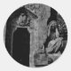 Une photo en noir et blanc avec un tombeau et une statue de deuil de femme. Trouvé dans le cimetière de Pere Lachaise, Paris sur autocollants.