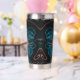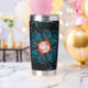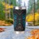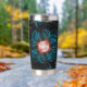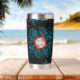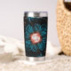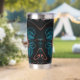This peach fractal flower on a turquoise background wraps and warps around the insulated tumbler that helps keep the secrets inside warm or cold as needed. The petals and stems bend around to form question marks, echoing the thousand questions that lay unanswered just below the dark waters of the psyche.