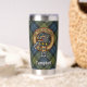 Le badge Campbell crest entouré d'une sangle et boucle sur l'arrière - plan tartan. Texte personnalisé des deux côtés.
