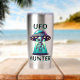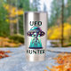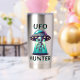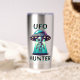 Graphisme d'OVNI et d'extraterrestre pour les amateurs d'ufologie. Un extraterrestre mignon descendu d'un OVNI. Le texte indique "Chasseur de OVNI" avec des autocollants noirs et turquoise.
