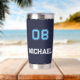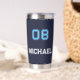 Créez votre propre personnalisation, personnalisée, cool, chic, tendance, classe, moderne, stylisée typographie bleu clair et blanc / police / script, 20 oz, double paroi isolante pour la rétention de température, durable, bleu marine foncé, acier inoxydable de qualité supérieure monogrammed nom de lecteur jersey numéro thermo tumbler qui garde vos boissons chaudes et votre cool de boissons cool, tout en gardant vos mains confortables. Entrez simplement votre nom / nom d'enfant / nom du joueur et numéro de maillot du joueur, pour customiser. Parfait pour vos boissons chaudes et froides préférées, boissons santé, tremblements, thé, café, soupe etc et pour le terrain de sport, randonnée, camping, trekking, école, collège, maison, bureau, frapper la salle de gym, assister à une réunion d'affaires, ou profiter d'un pique-nique dans le parc, la piscine ou la plage en été, autour du feu, ou sur la montagne en hiver. Fait un grand cadeau pour mariage, anniversaire, remise des diplômes, fête des pères, jour des mères, Noël, vacances, anniversaire du mariage, jour des valentines, retour à l'école, et plus, pour vos proches, enfants, petite amie, petit ami, maman, papa, fils, fille, frère, soeur, mari, femme, grands-parents, équipes, club, athlètes, joueur, entraîneur, sportifs, amis, amis et famille.