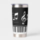 Modern, personalized music-themed tumbler featuring a piano keyboard and music notes with a name, monogram or custom text in your choice of colors and font styles (shown in black and white). Ideal for music teachers, musicians and music professionals. ASSISTANCE: For help with design modification, contact the designer BEFORE ORDERING via the Zazzle Chat MESSAGE tab below or email makeitaboutyoustore@gmail.com.