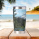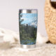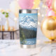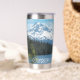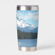 Un gobelet isotherme tendance en acier inoxydable pour vos boissons chaudes ou froides qui présente une image photographique panoramique d'un paysage de mont Hood enneigé et d'un lac paisible dans une forêt de conifères, situé dans l'État du Nord-Ouest Pacifique de l'Oregon. Fait un excellent souvenir de voyage !