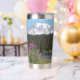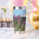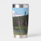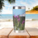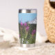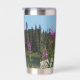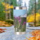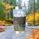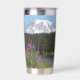 Un tondeuse thermique en acier inoxydable pour votre boisson chaude ou froide, avec une photo paysagère pittoresque du Mont Rainier enneigé et des fleurs sauvages d'algues roses.