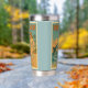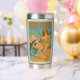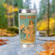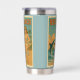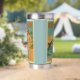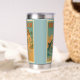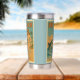 Cette bobine de plage est vraiment salée ! L'épingle inspirée des pin-up vintage impertinente manipule avec confiance la canne à pêche tandis que sa grosse prise, un requin fougueux, saute hors de l'eau. La scène est complétée par des palmiers, une voiture vintage et une tour de guet dans le fond. Cette variante effrontée de l'art d'affiche rétro classique vous fera rire. Ce gobelet bleu côtier amusant est isolé pour garder votre boisson chaude ou froide. Parfait pour la plage, la pêche ou les courses.
