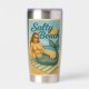 This salty beach is enjoying some time out of the water and under the sun. The gorgeous vintage inspired pin-up mermaid wears sunglasses and a sassy expression. This cheeky twist on classic retro poster art will make you smile. This fun stainless steel tumbler is insulated to keep your drink hot or cold. A perfect statement piece for your daily routine.
