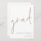 Grad Gold Script Graduation Faire-part. Disponible numériquement et imprimé. Ce design simple pour annoncer l'actualité de votre diplômé a un ensemble informel de script de style d'écriture pour l'en-tête principal, grad, et facile à personnaliser typographie en bas à droite avec vos détails et aussi votre message à l'arrière. Les couleurs texte et arrière - plan peuvent être modifiées si vous le souhaitez via l'option Modifier plus.