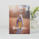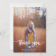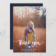 Ttypographie blanche chic superposition photo, carte de remerciements de graduation. Caractéristiques, saignement complet photo sur le devant, accent capuchon de graduation, cadre photo rond sur le dos avec couleur bleu marine arrière - plan.