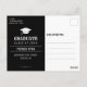 Annoncez votre graduation et invitation vos invités en style avec cette photo BBQ personnalisée carte postale invitation Grad party. Ce modèle moderne design présente une typographie blanche sur le noir accentuée par une illustration d'un hamburger au fromage avec les oeuvres. L'arrière de la carte postale contient les détails de votre graduation, accentués par un chapeau blanc. Félicitations pour votre diplôme ! Conçu par l'artiste Susan Coffey.