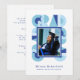 Retro-style, yet modern, graduation announcement and party celebration photo card that features the word "GRAD" designed with geometric shapes in various colors that form a border around the photo of the graduate. Retro colors—blue, teal, white—add to the card's retro style.
