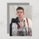 Envoyez un élégant carte de remerciements à votre famille et à vos amis pour les cadeaux de fin d'études à vous. Ce design présente votre photo sur le devant avec un script moderne qui lit. "Merci" avec votre nom et votre classe/année ci-dessous. Le dos de la carte est gris avec un message que vous pouvez personnaliser ou supprimer. Conçu par un artiste de renommée mondiale ©Tim Coffey.
