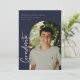 Faire-part/invitation de graduation de photo avec cadre d'arc, scénarisé moderne "diplômé". Caractéristiques, typographie blanche sur arrière - plans bleu marine.
