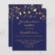 Une carte d'invitation glamour pour une fête de remise de diplômes 2025 (ou toute année) pour lui et elle. Un arrière - plan bleu marine décoré d'étoiles faux or. Personnalisez et ajoutez un nom et des détails du parti. Le texte Graduation et le nom sont écrits avec un script de style à la main moderne. Texte de couleur dorée.