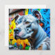 Art numérique coloré bleu, jaune, rouge et vert avec un Pitbull assis dans une rue de la ville entourée de graffitis.