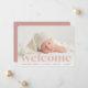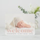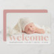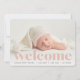 Un design faire-part de naissance doux et élégant avec un fond de saignement plein horizontale ou une photo orientée paysage avec "bienvenue" recouvert de lettrage rétro bloc. Le nom et les statistiques de naissance de votre bébé apparaissent en noir. Ajoutez trois photos de carré supplémentaires à l'arrière, ainsi qu'un message personnel.