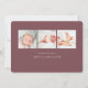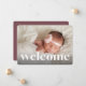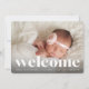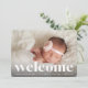 Un design faire-part de naissance doux et élégant avec un fond de saignement plein horizontale ou une photo orientée paysage avec "bienvenue" recouvert de lettrage rétro bloc. Le nom et les statistiques de naissance de votre bébé apparaissent en dessous en blanc. Ajoutez trois photos de carré supplémentaires à l'arrière, ainsi qu'un message personnel.