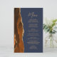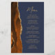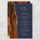 Le bord gauche de cet élégant menu mariage moderne comporte une bordure d'aquarelle orange brûlée et rouille ornée d'une parties scintillant en faux or. Le texte personnalisable combine écriture manuscrite de brosse couleur or et polices sans serif sur un arrière - plan bleu marine. L'envers est assorti d'une agate orange brûlée et dorée.