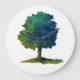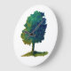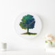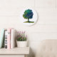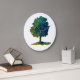 Un arbre à ombre vert terreux dans de nombreuses nuances, a de l'herbe qui pousse en dessous, et est centré sur l'horloge qui a des aiguilles noires pour indiquer l'heure.