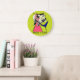 Ajoutez une touche d'amour et de couleur à votre maison avec cette horloge murale ronde accrocheuse. Le design vibrant dominé par le jaune présente un adorable couple de dessins animés, personnalisé avec deux noms de votre choix.