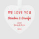 Cadeau de Noël mignon pour grand-mère et grand-père. Sur le devant, votre image remplit un cadre en forme de coeur. Au contraire, vous pouvez personnaliser l'expression "Je t'aime" ou "Nous t'aimons", et personnaliser s'ils sont appelés "Grand-mère & Grand-père", "Nana & Papa", "Maman & Poppop", etc. Vous pouvez également ajouter les noms et l'année des petits-enfants ou des petits-enfants, le tout en typographie rouge contre un arrière - plan blanc.