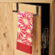 Une serviette de cuisine motif de fête poinsettia avec de grandes fleurs rouges et roses foncées et des bordures rouges profondes.