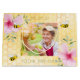 Pour un 100ème anniversaire d'été. Jaune, arrière - plan blanc avec un motif de nid d'abeille. Décoré de fleurs tropicales roses, d'hibiscus et d'abeilles jolies. Ajoutez votre propre photo. Modèles pour une date et l'âge 100. Lettres de couleur verte.