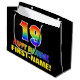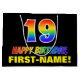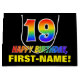 Ce sac cadeau joyeux, amusant et coloré sur le thème de l'anniversaire comprend un grand nombre de "19" et le message "HAPPY BANTHDAY", tous deux ayant un dégradé arc-en-ciel coloré inspiré couleur motif, ainsi qu'un nom de destinataire personnalisable jaune gras. L'arrière - plan est noir de couleur. Un sac cadeau amusant comme celui-ci pourrait être utilisé pour envelopper des cadeaux donnés à quelqu'un pour célébrer son dix-neuvième anniversaire. [~Z0000477]