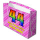 Ce modèle de sac cadeau amusant et joyeux de 44e anniversaire a un grand nombre de "44" avec un motif dégradé inspiré du spectre arc-en-ciel. Il comporte également le message "Joyeux 44e anniversaire", et un nom personnalisable. L'arrière - plan est décoré d'un joyeux motif aux rayures rose clair et rose foncé, aux coeurs roses aimés. Des sacs-cadeaux comme celui-ci peuvent être utilisés pour envelopper des cadeaux ou des cadeaux donnés pour célébrer le quarante-quatrième anniversaire de quelqu’un. [~Z0000414]
