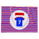 Ce sac cadeau de 7e anniversaire est facile à personnaliser : il suffit de taper le nom de la fille ou du garçon d'anniversaire dans la boîte. La bannière d'anniversaire rouge déclare "ANNIVERSAIRE" en lettres majuscules noires - ou cela peut aussi être édité. Les rayures rouges et bleues correspondent au papier de tissu rayé également disponible dans la collection.