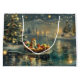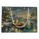 Jetez un coup d'oeil à la magie de la saison des Fêtes avec cette illustration magnifiquement détaillée, montrant un chien fier assis dans un bateau à la décoration festive, glissant à travers un lac serein de Noël. Les lumières scintillantes des pins voisins se reflètent dans l'eau, projetant une lumière chaude et festive qui renforce l'ambiance cosy. Des ornements pendent des côtés du bateau, tandis que des lanternes brillantes éclairent le chemin, créant une scène qui capture l'essence véritable de la chaleur et de la joie de Noël. Cette oeuvre nostalgique apporte une touche de magie de vacances à tout espace, parfait pour ceux qui chérissent l'esprit de la saison.