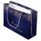 Un sac cadeau pour un 21e anniversaire girly et glamour (ou tout âge). Un arrière - plan bleu marine décoré de parties scintillant rose dorée brille. La couleur bleue est inégale. Personnalisez et ajoutez une date, un nom et un âge de 21 ans. Le texte : Le nom est écrit en blanc avec un script de style à la main moderne