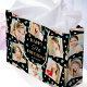 Créez un sac cadeau de collage photo élégant avec six photos préférées! Personnalisez le modèle avec le nom et l'âge du bénéficiaire. Un design élégant avec un motif de confettis, des étoiles et des photos en forme de carré, parfait pour la famille et les amis. Couleurs imprimées : bleu-vert turquoise, noir, blanc et éléments faux or.
