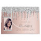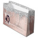 Un sac cadeau pour un 21e anniversaire girly et glamour (ou tout âge). Un arrière - plan d'or rose faux métallique avec or rose, rose et faux argent parties scintillant gouttes, la peinture goutte à goutte. Personnalisez et ajoutez une date, un nom et un âge de 21 ans. Texte : Le nom est écrit en gris rose foncé avec un script de style moderne écrit à la main. Personnalisez et ajoutez votre propre photo de la fille d'anniversaire. Peut être utilisé à la fois comme un sac cadeau et un sac de faveur.
