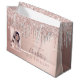 Un sac cadeau pour un 21e anniversaire girly et glamour (ou tout âge). Un arrière - plan d'or rose faux métallique avec or rose, rose et faux argent parties scintillant gouttes, la peinture goutte à goutte. Personnalisez et ajoutez une date, un nom et un âge de 21 ans. Le texte : Le nom est écrit en or rose foncé avec un script de style manuscrit moderne. Personnalisez et ajoutez votre propre photo de la fille d'anniversaire. Peut être utilisé à la fois comme un sac cadeau et un sac de faveur.