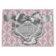 Sac cadeau de baby shower pour fille avec un magnifique nœud diamant argenté et chaussure de bébé sur un fond damassé argenté élégant. Ce sac cadeau pour bébé fille est facilement personnalisable en changeant la couleur de fond.