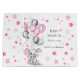 Un art baby shower mignon avec un éléphant de petite fille aux oreilles roses tenant des ballons aux couleurs rose, blanc et argent. Conception de baby shower adorable avec des étoiles roses et crème autour. Personnalisez en changeant le texte et les détails.