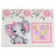 Sac cadeau avec une jolie illustration d'aquarelle d'éléphant rose. Elle a de jolies oreilles de pois roses et blancs et un joli ruban rose au-dessus de sa tête. Le sommet est décoré d'un beau bouquet de roses.