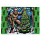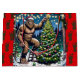 Un drôle de sac cadeau de Noël avec Bigfoot, alias Sasquatch décorant un pin dans une forêt lunaire festive. C'est fait dans un amusant dessin humoristique de style bande dessinée.