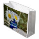 Ce grand sac cadeau comporte de jolies marguerites blanches dans un encorbellement bleu cobalt. Le texte peut être modifié ou éliminé pour répondre à vos besoins.