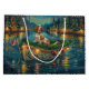 Jetez un coup d'oeil à la magie de la saison des Fêtes avec cette illustration magnifiquement détaillée, montrant un chien fier assis dans un bateau à la décoration festive, glissant à travers un lac serein de Noël. Les lumières scintillantes des pins voisins se reflètent dans l'eau, projetant une lumière chaude et festive qui renforce l'ambiance cosy. Des ornements pendent des côtés du bateau, tandis que des lanternes brillantes éclairent le chemin, créant une scène qui capture l'essence véritable de la chaleur et de la joie de Noël. Cette oeuvre nostalgique apporte une touche de magie de vacances à tout espace, parfait pour ceux qui chérissent l'esprit de la saison.