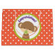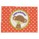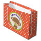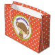 Un sac cadeau, grand format qui dit félicitations! Avec un mignon petit singe avec une suce dans la bouche Dans un cercle vert olive. L'arrière - plan est un motif à pois orange et blanc.
