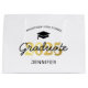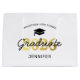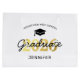 Sacoche cadeau de graduation personnalisée avec un casquette diplômé, 2025 en faux or, nom de l'école, nom des élèves, et le mot diplômé dans une police de script.