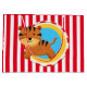 Un mignon tigre de bande dessinée saute à travers un cerceau rayé rouge et blanc dont le centre blanc, jaune et bleu est encadré de bandes verticales blanches et rouges vifs.