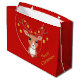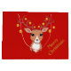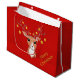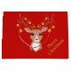 Sac cadeau avec un cerf de Noël mignon au centre sur fond rouge. Le renne est décoré de boules dorées.