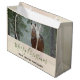Grand sac cadeau avec une photo d'un cheval brun avec une longue crinière blanche. Debout dans une forêt avec des flocons de neige qui tombent tout autour.