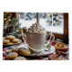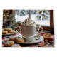 Magnifique sac cadeau de Noël saisonnier avec une illustration de chocolat chaud, biscuits à sucre, tranches d'orange séchée, bâtons de cannelle et un sapin de Noël devant une fenêtre d'hiver.