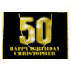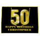 Une conception propre, moderne et d'amusement d'un chiffre cinquante d'or de faux qui semble être ensemble tridimensionnel sur un fond noir et d'or sur lequel les modèles pour votre salutation personnalisée à l'homme ou à la femme d'anniversaire apparaît. Idéal pour des cinquantième célébrations d'affaires aussi.
