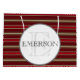 Il s'agit d'un design classique de rayures rouges tan blanc customisé avec nom et monogramme centré dans un cercle.