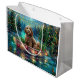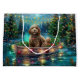 Jetez un coup d'oeil à la magie de la saison des Fêtes avec cette illustration magnifiquement détaillée, montrant un chien fier assis dans un bateau à la décoration festive, glissant à travers un lac serein de Noël. Les lumières scintillantes des pins voisins se reflètent dans l'eau, projetant une lumière chaude et festive qui renforce l'ambiance cosy. Des ornements pendent des côtés du bateau, tandis que des lanternes brillantes éclairent le chemin, créant une scène qui capture l'essence véritable de la chaleur et de la joie de Noël. Cette oeuvre nostalgique apporte une touche de magie de vacances à tout espace, parfait pour ceux qui chérissent l'esprit de la saison.