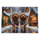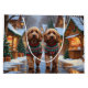 This festive design captures the joyful spirit of the holiday season, featuring an adorable dogs.Nestled in a winter wonderland, complete with a decorated Christmas tree, and beautifully wrapped presents. Snowflakes gently fall, adding a magical touch to the scene, while the vibrant colors of the holiday decorations create a warm and cheerful atmosphere.